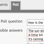 Wenn Sie einen Umfragebutton beim Verfassen eines Textes sehen, können Sie diesem Text eine Umfrage hinzufügen. Formulieren Sie eine Frage und schreiben Sie die Antwortmöglichkeiten in das Textfeld. Sie können auch angeben, wie lange eine Umfrage gültig ist. Sie können mehrfache Antworten zulassen und zusätzlich einstellen, ob eine Stimme nachträglich geändert werden darf und ob die Ergebnisse nach Stimmen sortiert werden sollen. Bedenken Sie, dass bei Mehrfachumfragen die Gesamt-Prozentzahl den Wert 100 weit überschreiten kann!