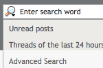Im Kopfbereich jeder Seite finden Sie ein Suchfeld, dessen Funktion sich dynamisch der gerade angezeigten Seite anpasst. Sie durchsuchen immer den aktuellen Bereich, in dem Sie sich gerade befinden. Benutzen Sie also die Suchfunktion während Sie in einem Thema lesen, so wird nur das Thema durchsucht, wollen Sie das gesamte Forum durchsuchen, müssen sie also die Suche auf der Startseite beginnen. Wenn Sie auf das Suchicon klicken, öffnet sich ein Dropdown-Menü mit häufig genutzten Suchanfragen. Außerdem enthält es auch den Link zur Erweiterten Suche, welche viele zusätzliche Suchoptionen bietet.